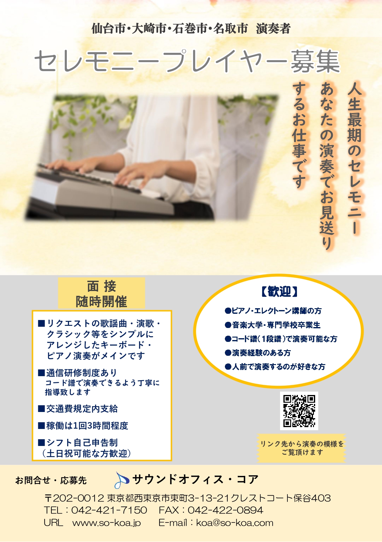 宮城県仙台市・石巻市近郊のセレモニー会場でのキーボード演奏者を募集いたします。