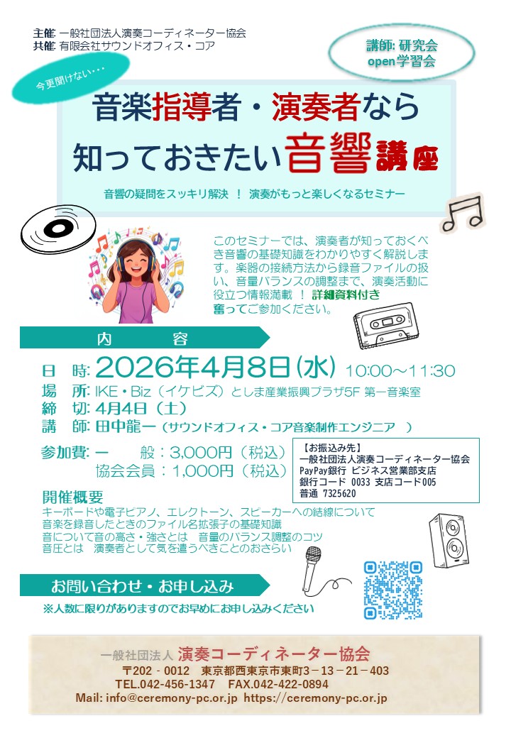 4/8特別開催「音楽指導者・演奏者なら知っておきたい音響講座」