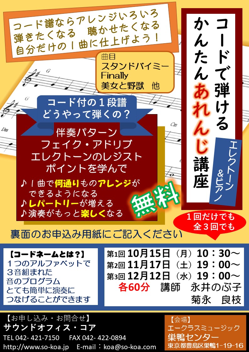 「コードで弾けるかんたんあれんじ講座」(全3回:1回60分)